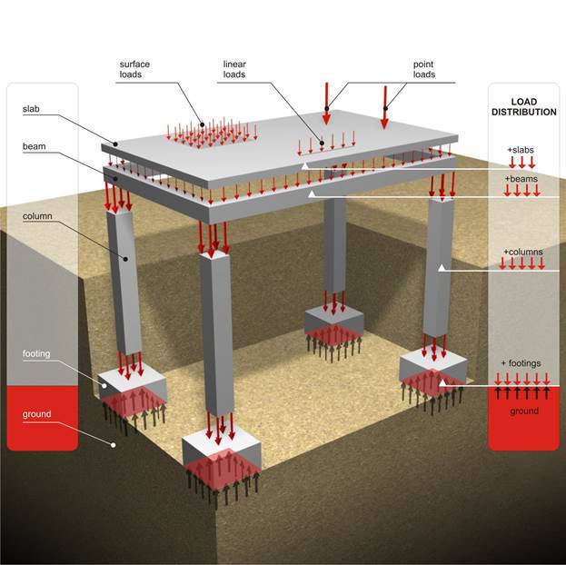 Every kilo of roof, floor, furniture and person ends up pressing on the ground. We trace that path from top to bottom.